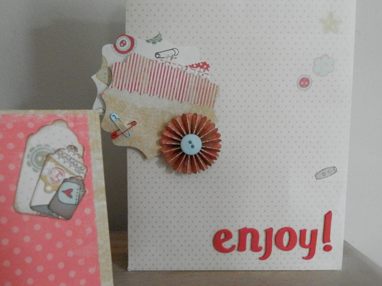 Notamment le détail de la décoration: deux étiquettes réalisées avec une découpe ''baroque'' dans la même collection de papier la 1ère collée sur la pochette la seconde avec des 3D ... une rosace découpée à la Big Shot surmontée d'un bouton et 2 mini épingle à nourrice des 2 couleurs dominantes du papier!